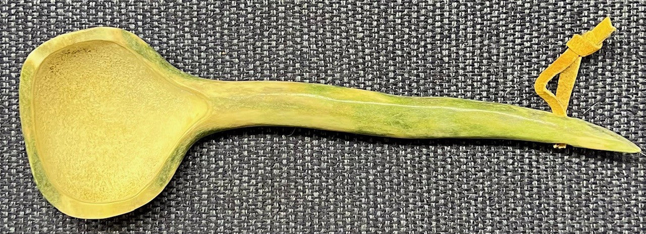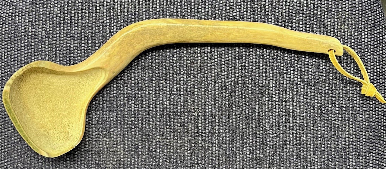 Decorative spoon carved from caribou antler with a seal skin string .Made by Alaska Native artist Roswell Schaeffer, Jr. Measures approximately 10" long.