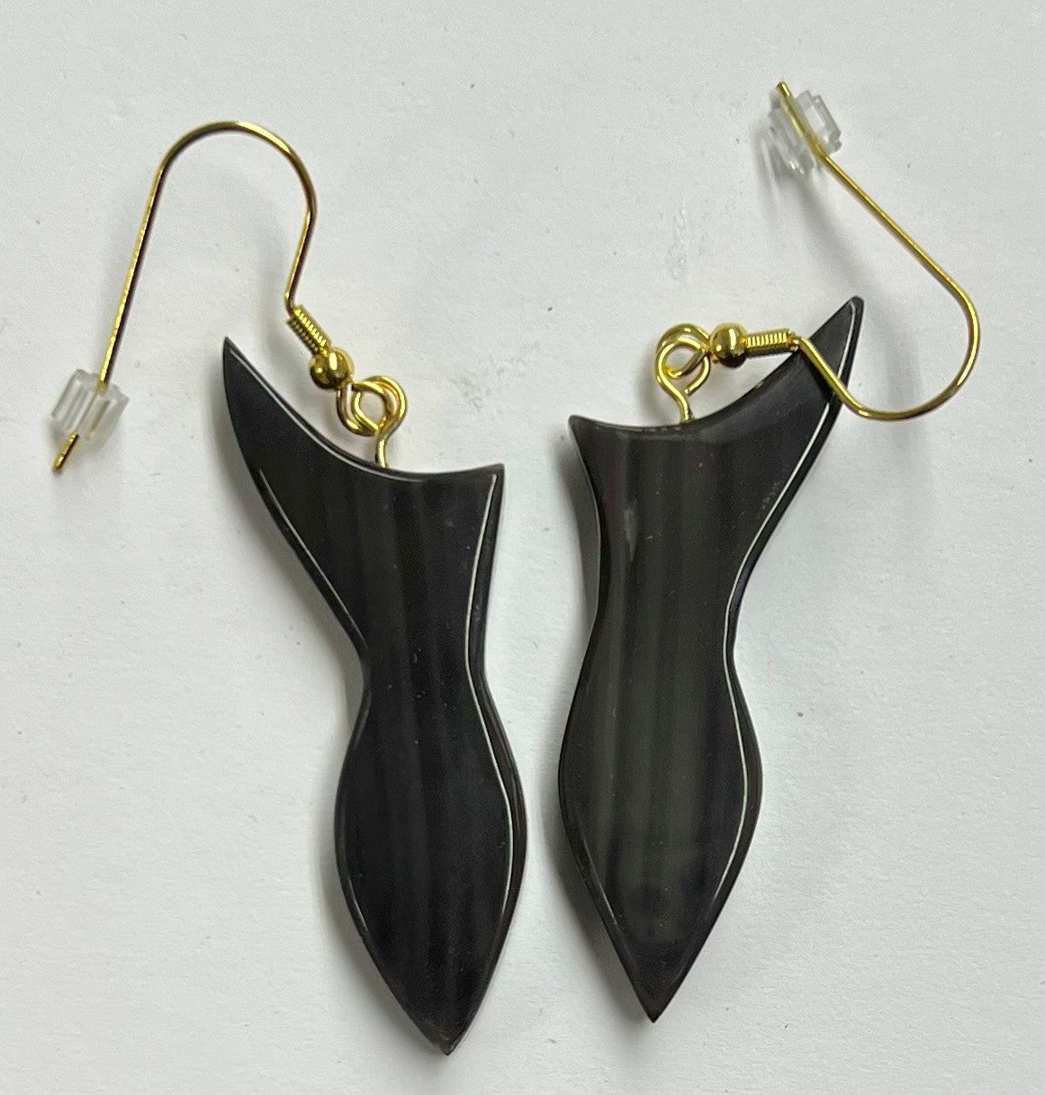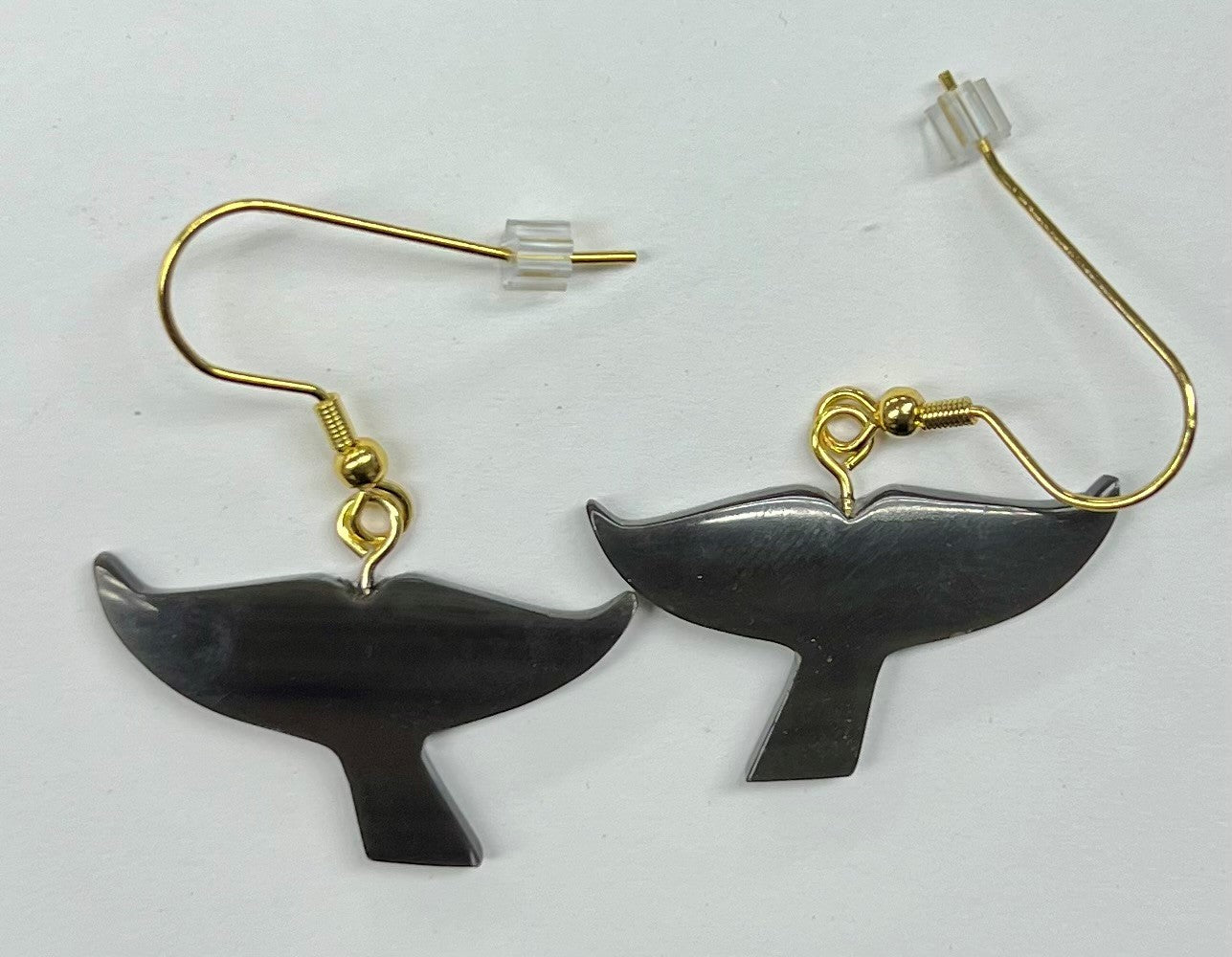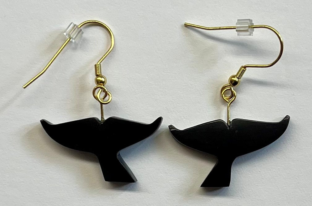 These are whale's tail earrings made from baleen mounted on fossil walrus ivory . Made by Alaska Native Inuit artist Jon Ipalook of Point Hope, Ak. Earring measures approximately 3/4" x1".
