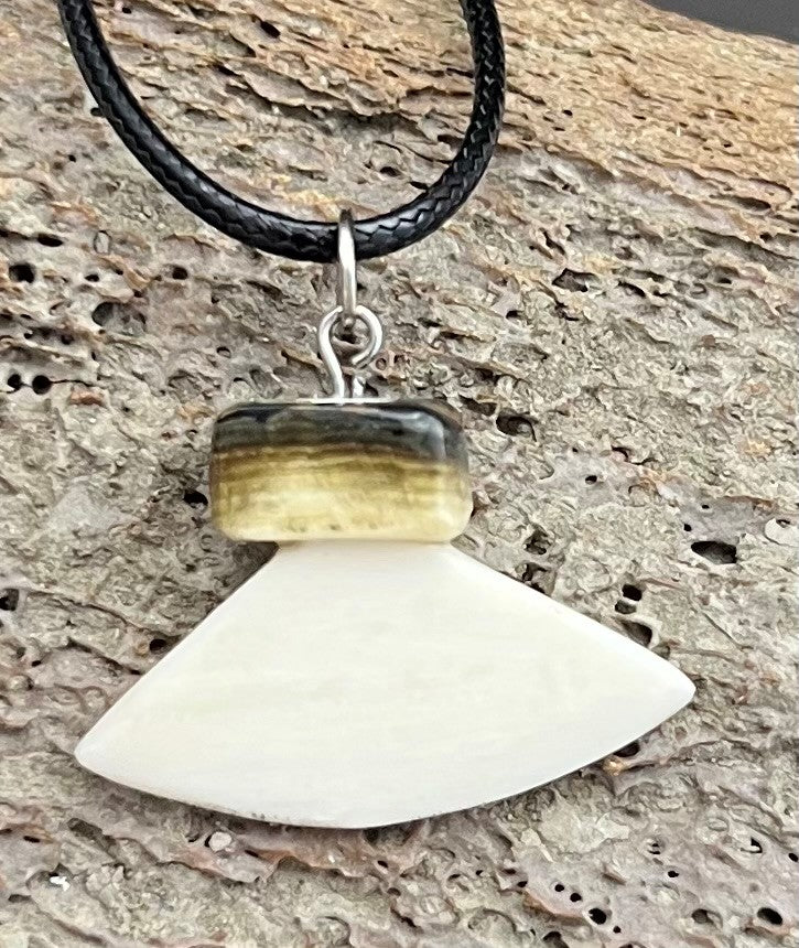 Heart necklace crafted from mammoth ivory and walrus ivory. Made by Alaska Native artist David Foster. Measures approximately 1.5", 1.25''.,1.75. Necklace cord measures approximately 20".