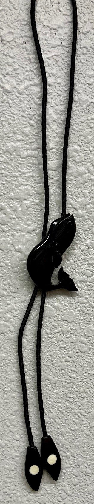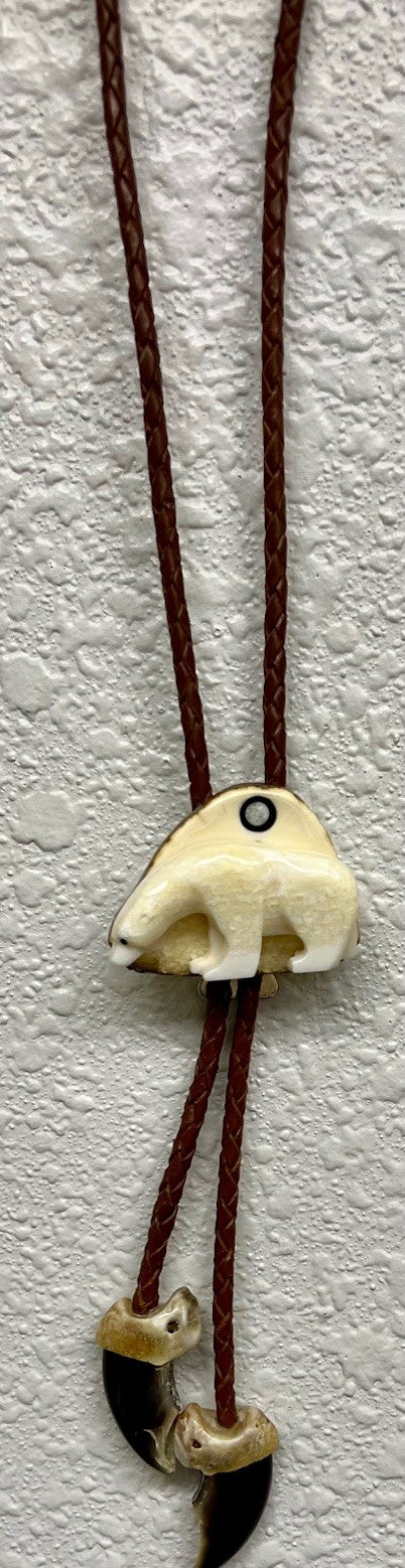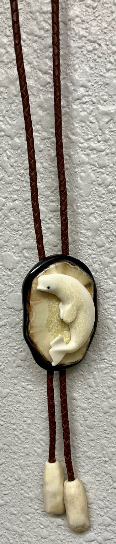 Bolo tie carved from baleen & fossil walrus ivory . Made  by Alaska Native artist Jon Ipalook. Measures approximately 2" wide, 3" high,. Adjustable leather cord measures 38"around .