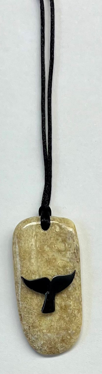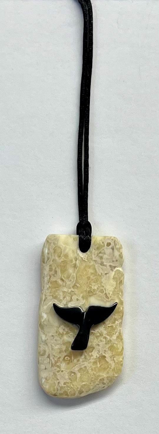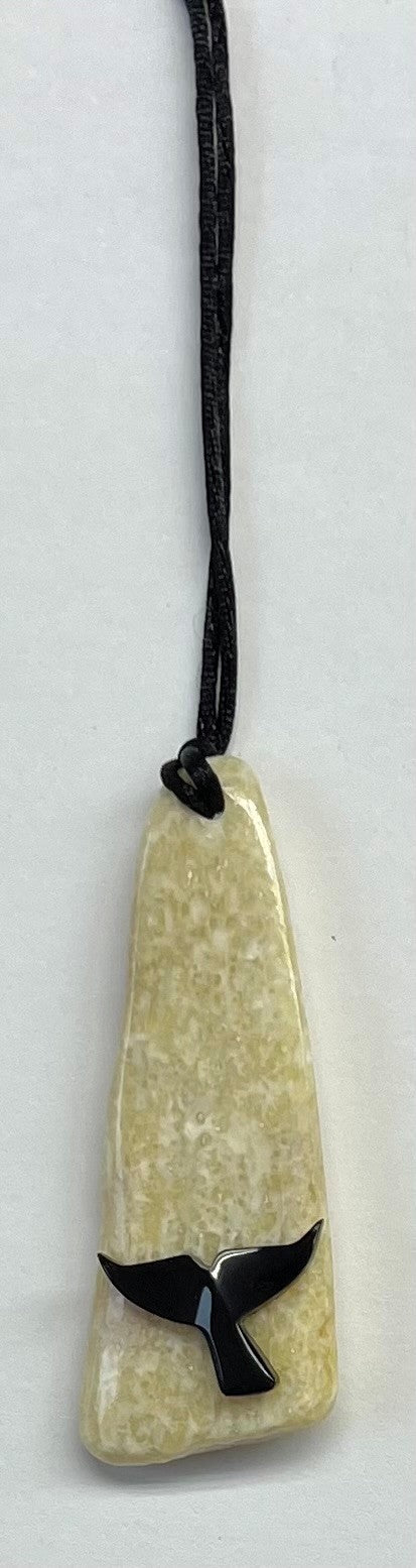 Necklace carved from fossil walrus ivory and baleen. Carved by Alaskan Native artist Jon Ipalook of Point Hope, AK. Measures approximately 1." high by 0.75" wide . Cord is approximately 24" long.