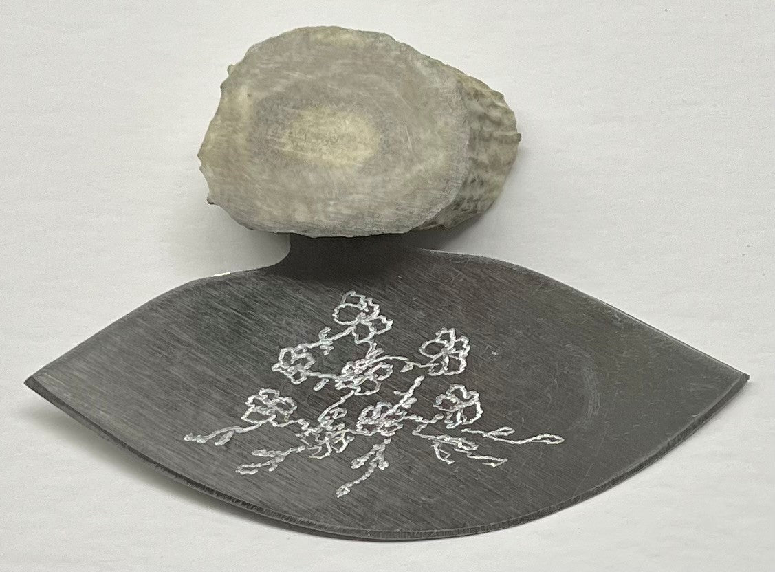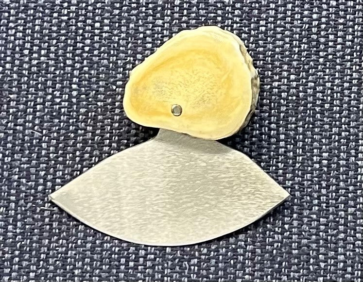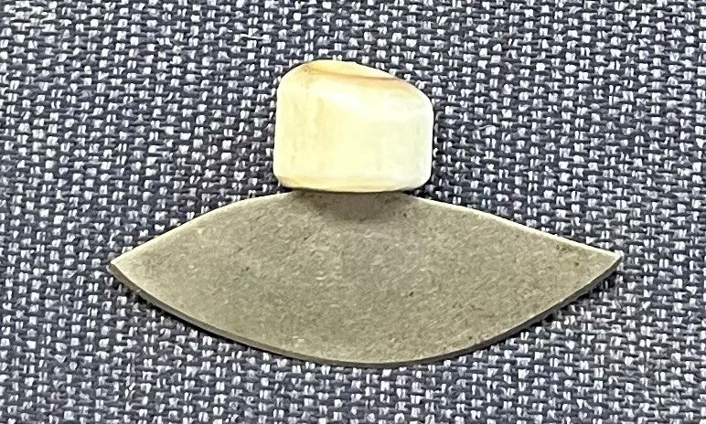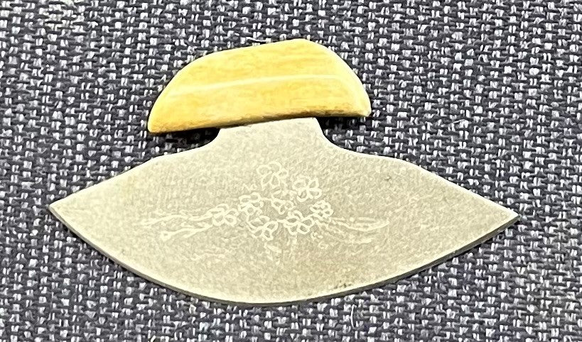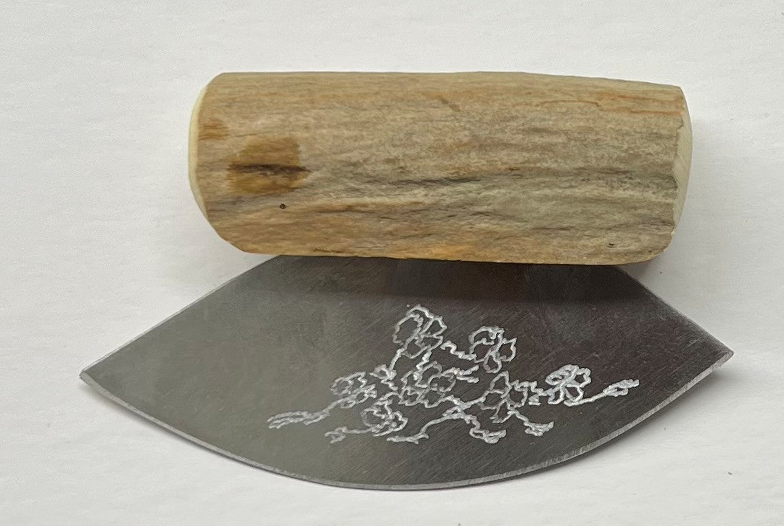 Ulu made from saw blade and caribou handle. Made by Alaska native artist Carl Henry. Measures approximately 2.5" by 3"long.