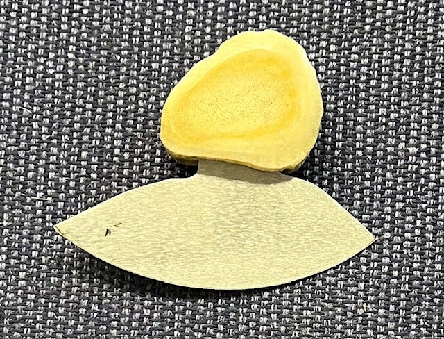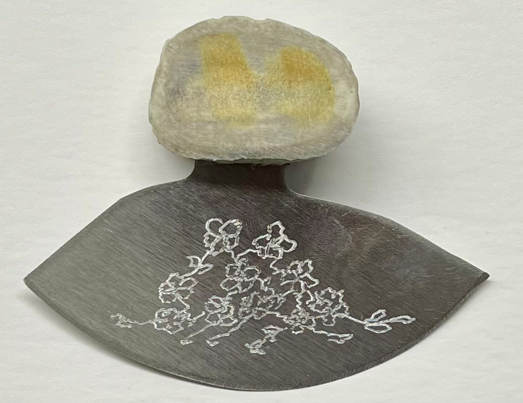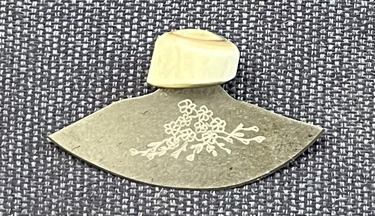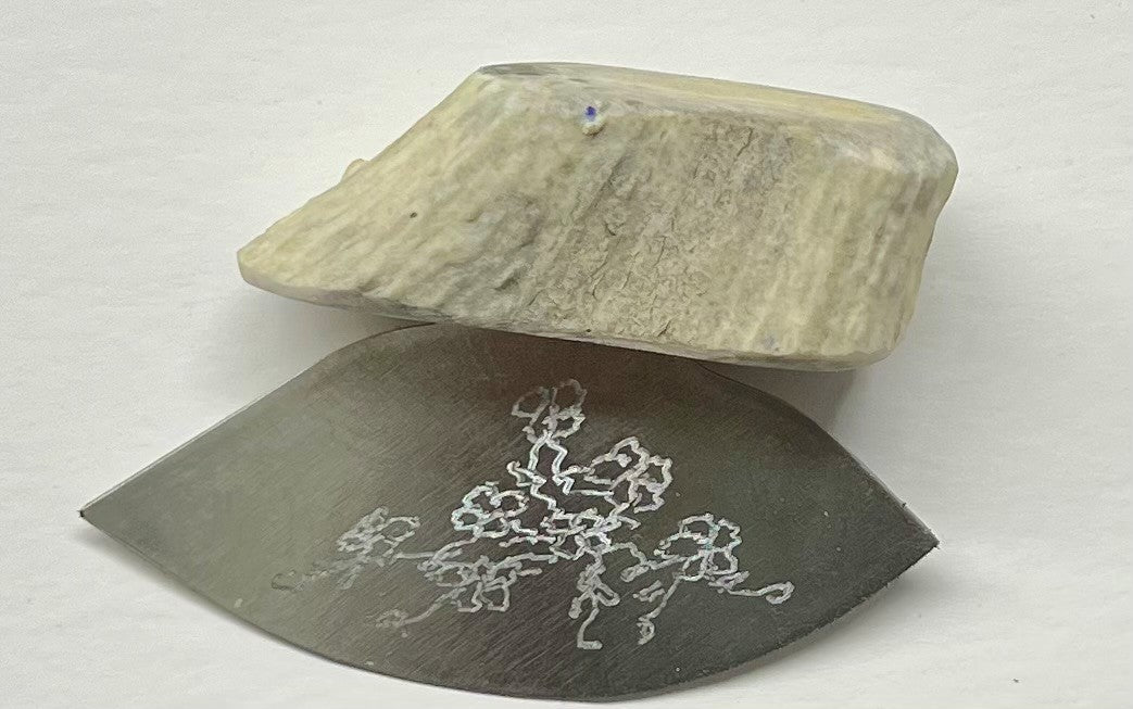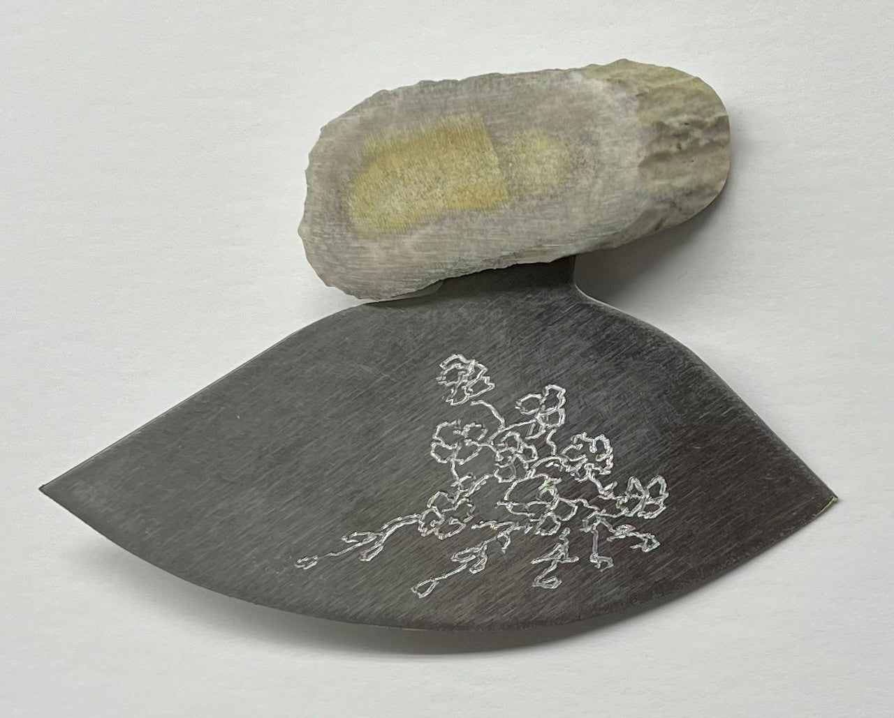 Ulu made from saw blade and caribou handle. Made by Alaska native artist Carl Henry. Measures approximately 2.5" by 3"long.