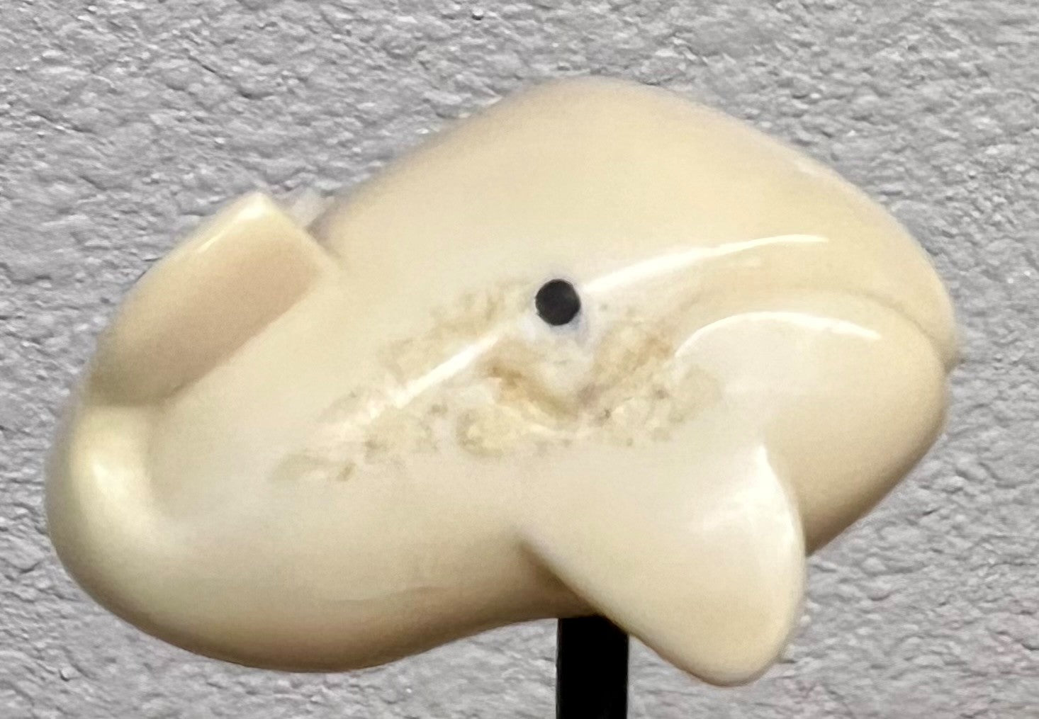 Whale carved with walrus ivory and baleen. Made by Alaskan Native artist Don Ferguson. 3,75" x2."wide.